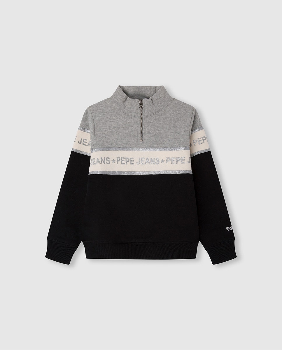 Sudadera de niña color block gris y negro con logo glitter en panel y cuello cremallera