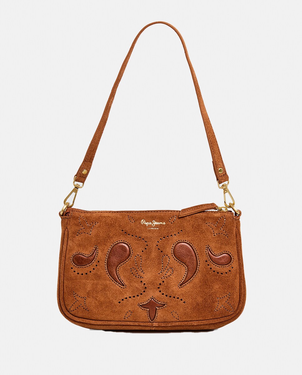 Bandolera pequeña de piel en camel con detalles en frontal