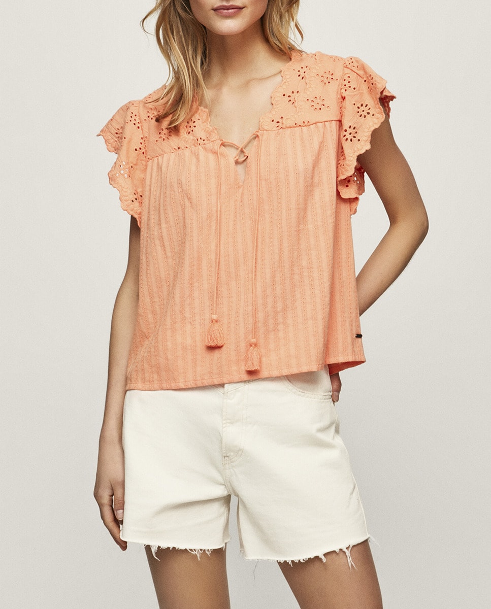 Top de mujer con detalles calados en canesú y manga mariposa