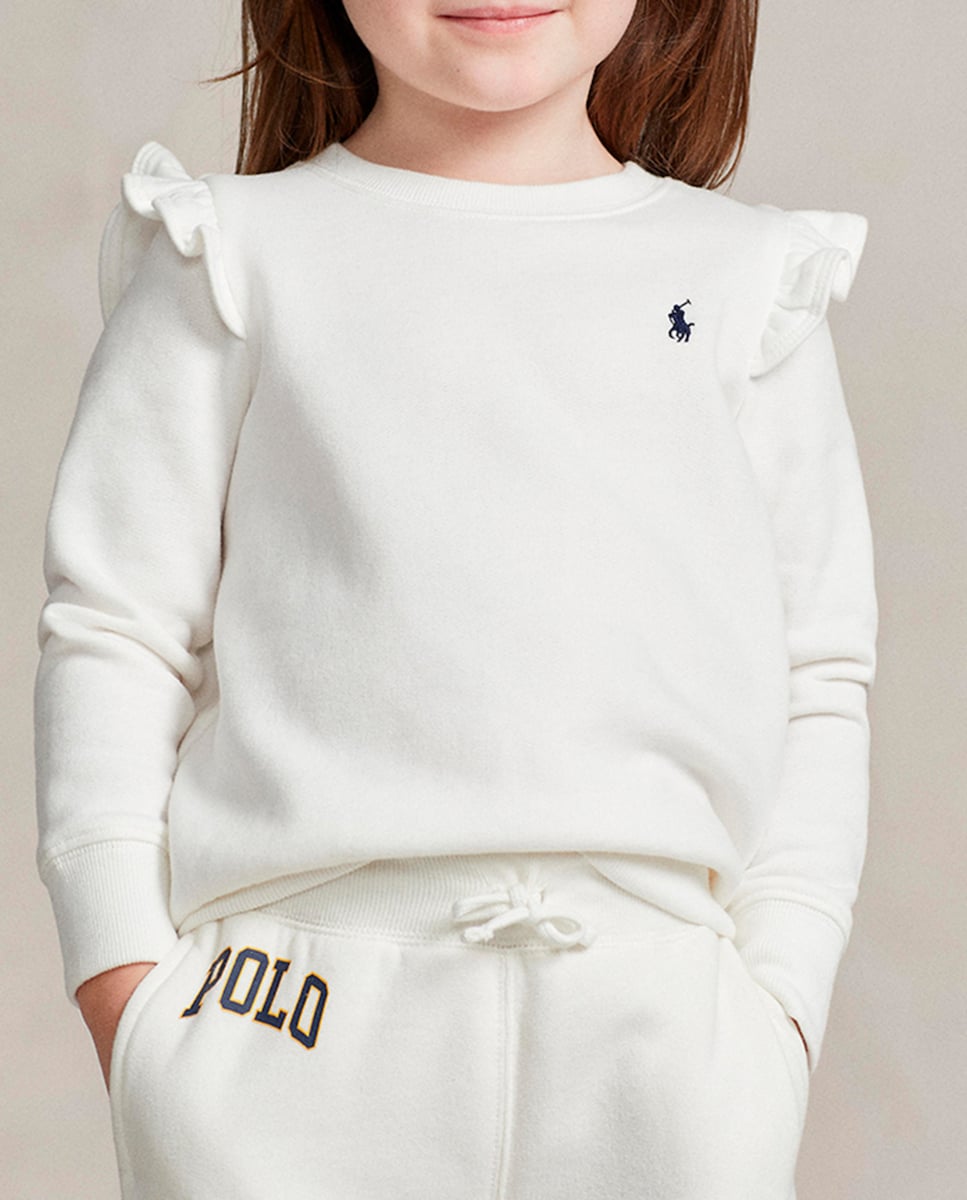 Sudadera de niña en blanco con volantes en los hombros