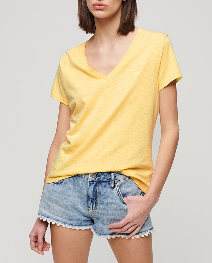 Camiseta de mujer flameada con cuello de pico bordada Studios