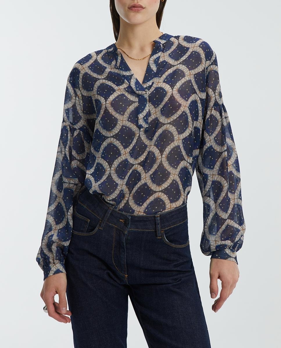 Blusa de mujer estampada de manga larga, cuello pico