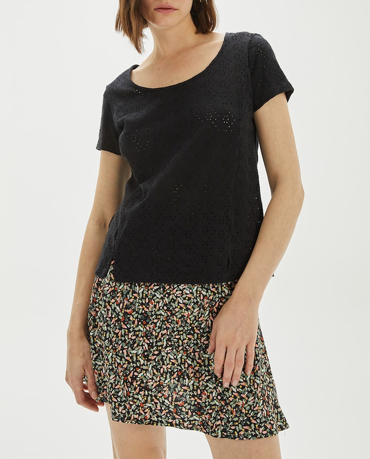 Camiseta negra tejido calados manga corta abullonada de mujer