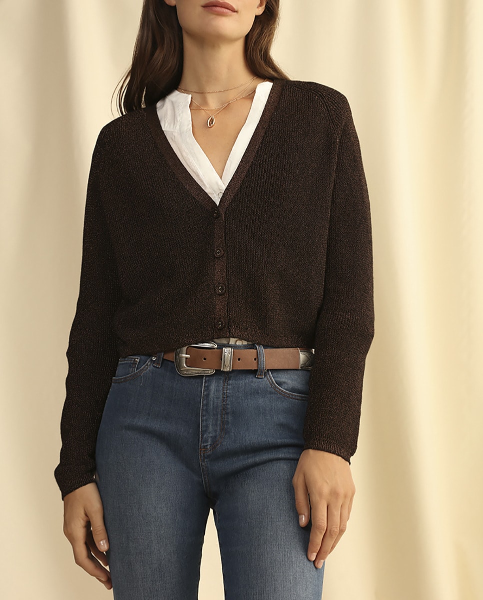 Chaqueta de punto de mujer con lurex y cuello pico