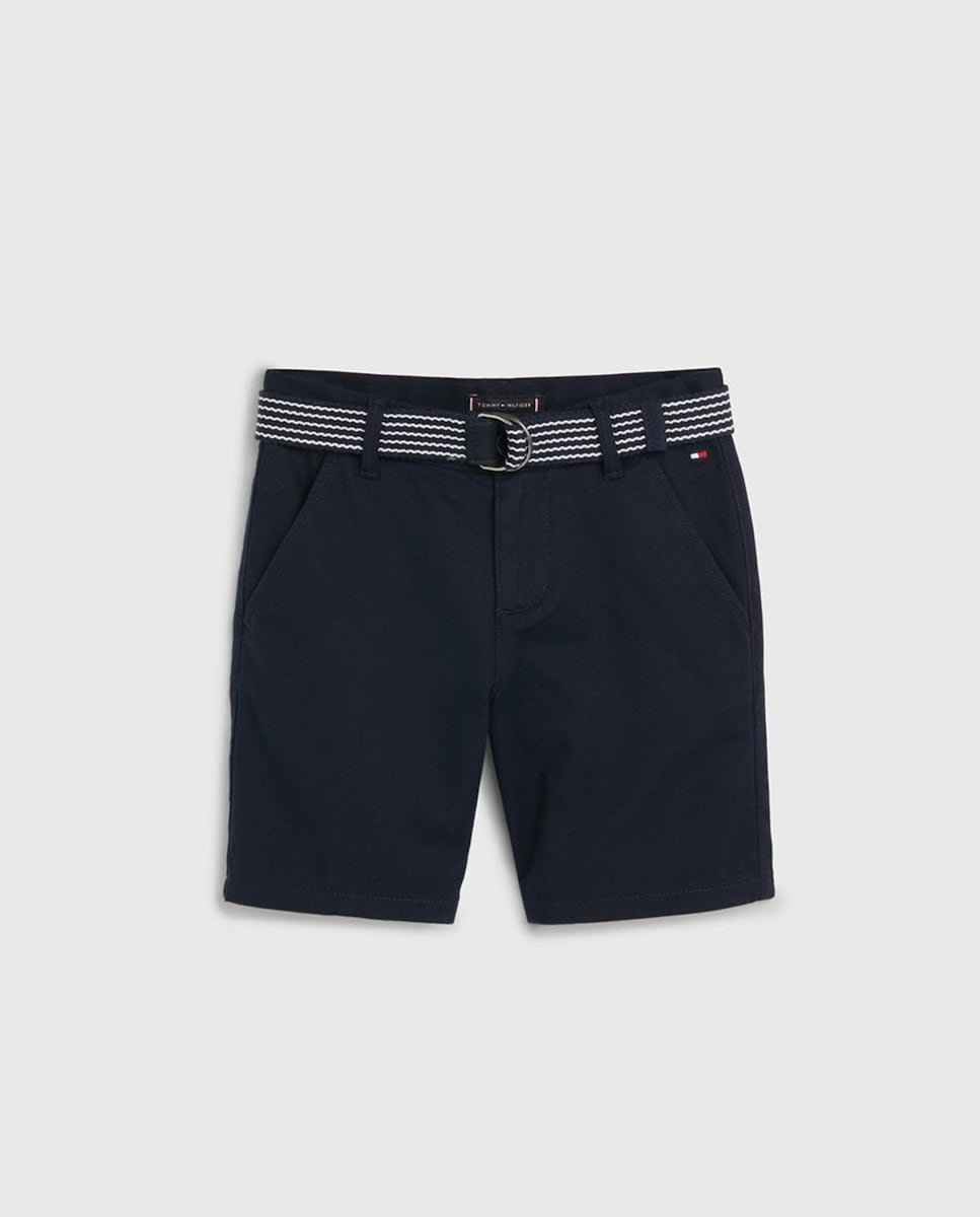 Pantalón corto de bebé niño liso con logo bandera en el bolsillo y cinturón incluido