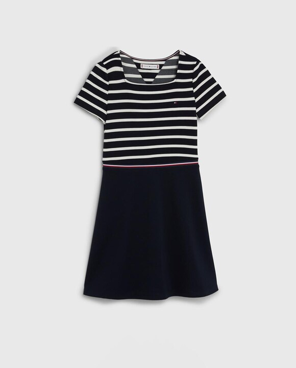 Vestido de punto manga corta con parte de arriba a rayas y falda lisa con logo bandera