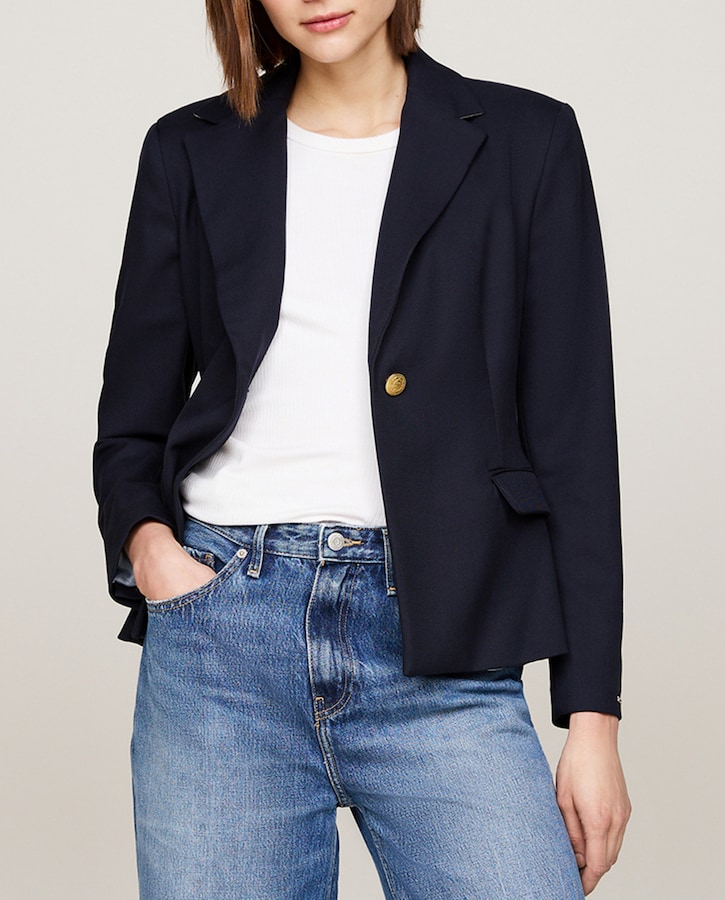 Americana de mujer con cierre de un botón y bolsillos frontales