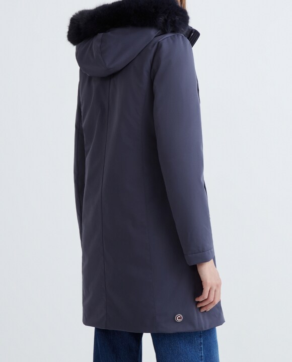 Abrigo de mujer 3/4 con capucha, tejido efecto satinado