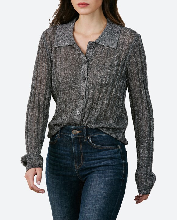 Cárdigan de mujer con cuello polo de tejido brilloso